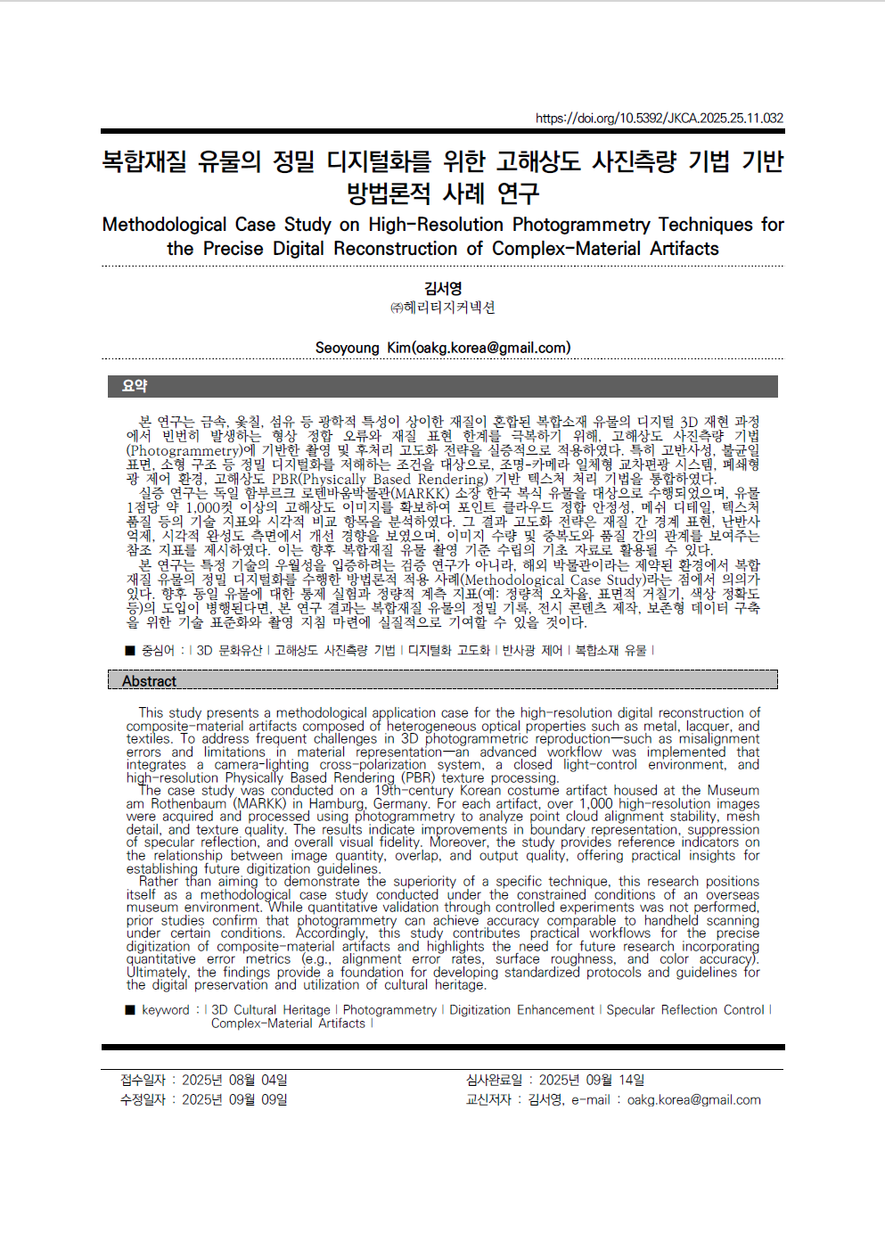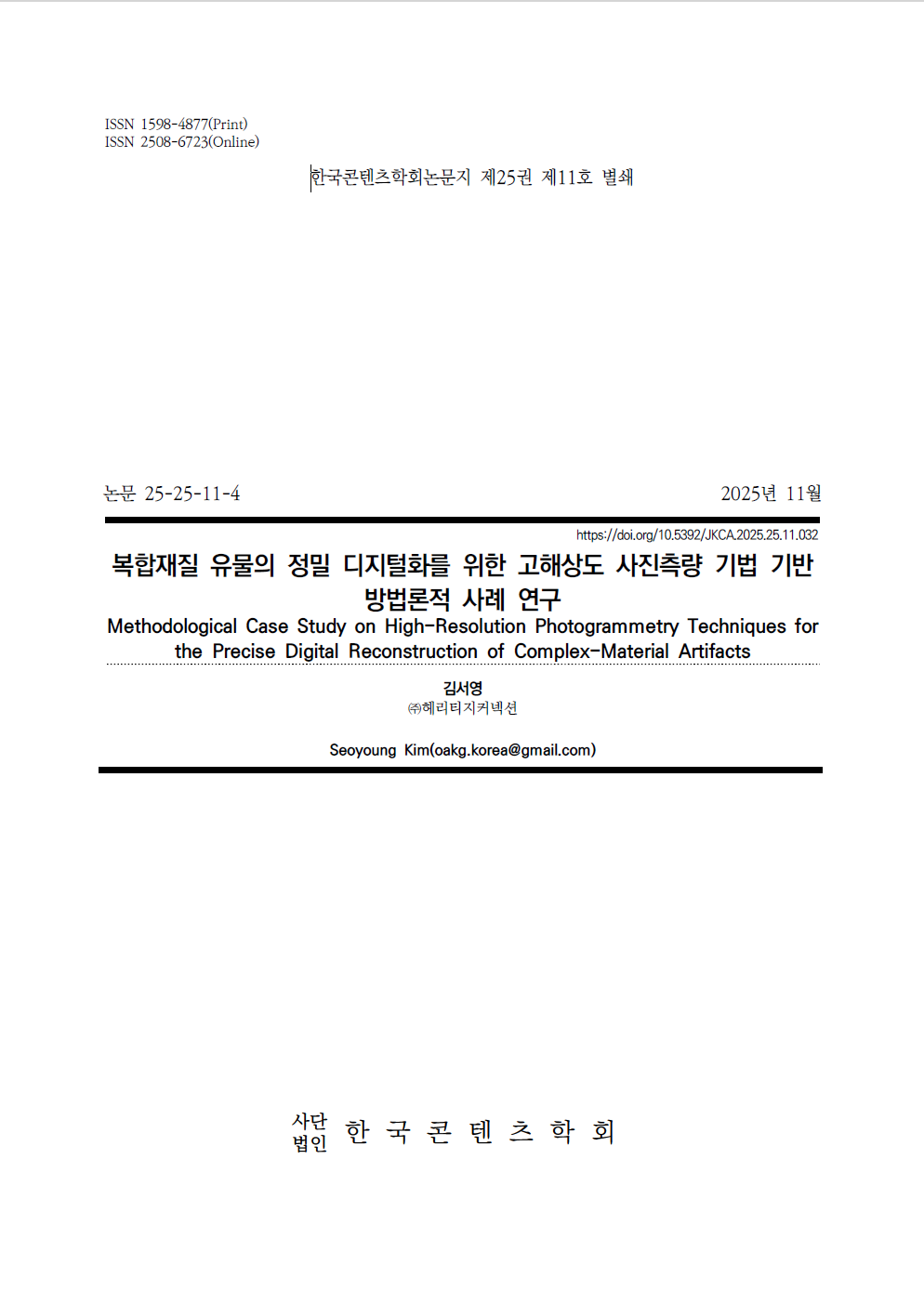 Seoyoung Kim, “Methodological Case Study on High-Resolution Photogrammetry Techniques for the Precise Digital Reconstruction of Complex-Material Artifacts”, Journal of The Korea Contents Association, Vol.25, No.11, p.032~p.039, 2025(11)